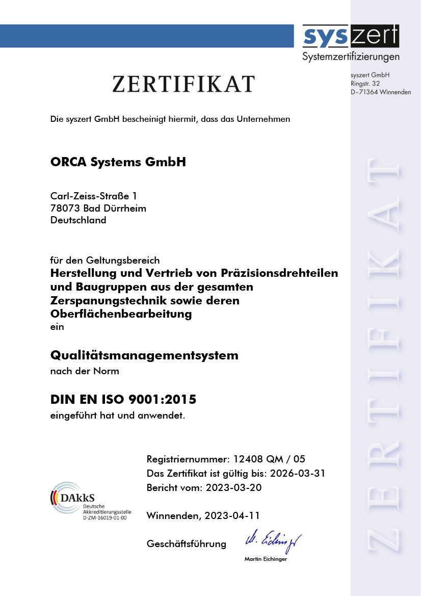 Zertifikat ISO 9001:2015 ORCA Systems GmbH